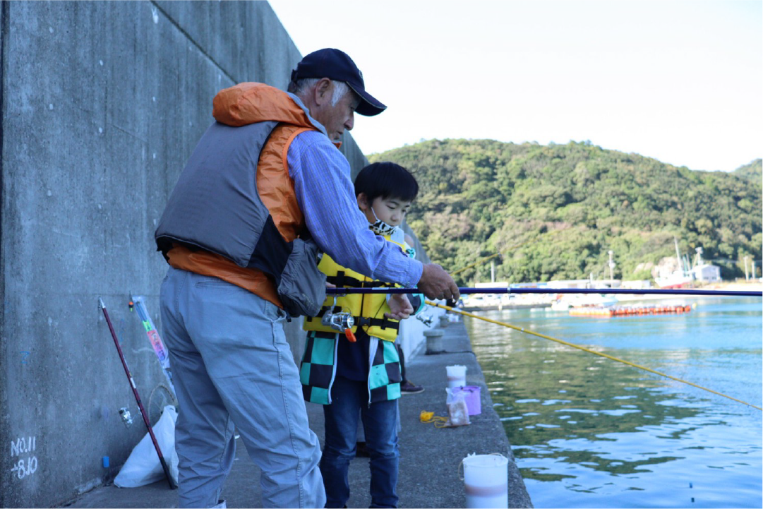 すさみ町の波止で地元の釣り名人が竿い方、エサの付け方、釣り方を体験します。