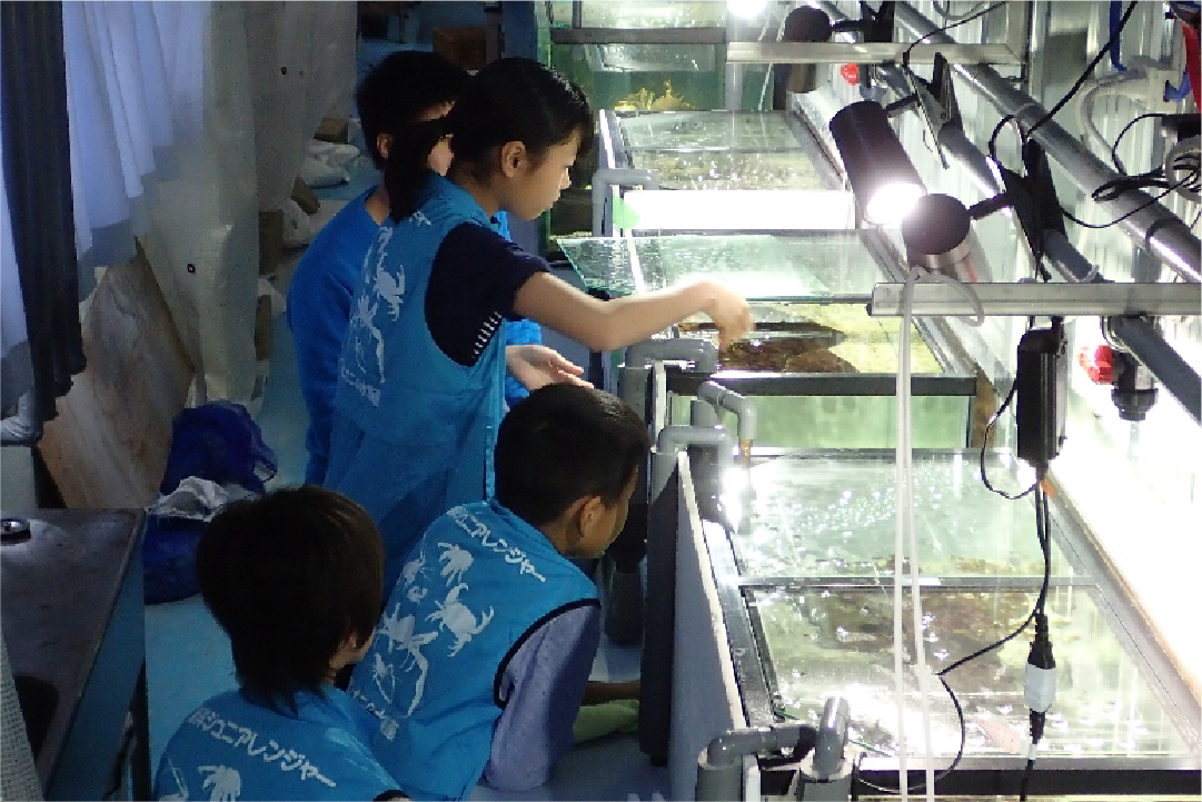 珍しいエビやカニが飼育されている水族館のバックヤードと海岸で磯観察を体験します。