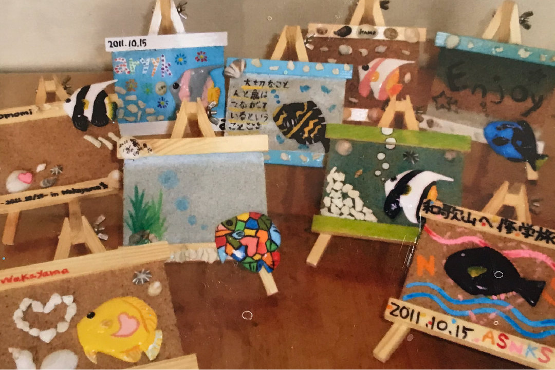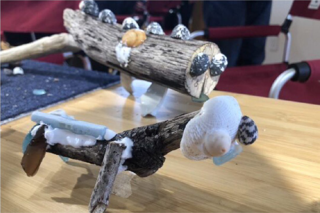 海岸で貝殻や漂着物を採取し、工作物やフレームを作成します。
